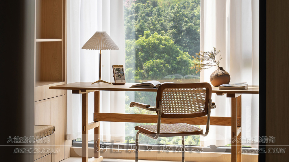 書房與客廳以半墻相隔,通透卻又自成一體,是長輩們最愛的獨立空間,兼具喝茶、書法、臨時臥房等功能,超大的單邊實木畫案可滿足家里長輩書寫大幅字畫的愛好。在豐沛的自然光線下,揮毫潑墨、茶香四溢滿屋,為嫻靜的書房疊加文人氣韻,如同詩人在書房中揮毫潑墨,享受著創作的樂趣。