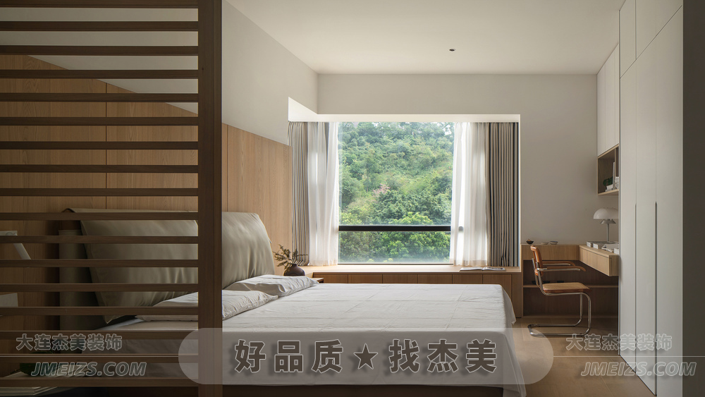 臥室延續了自然溫暖的色調,木色沿著墻壁與地面蔓延至窗邊,通透的窗扇成為感知四季的窗口。柔軟的光被紗簾篩碎,撒在窗邊,靜下心來感受風的流動,獨享靜謐時光,如同詩人在月光下獨酌,享受著孤獨的美好。