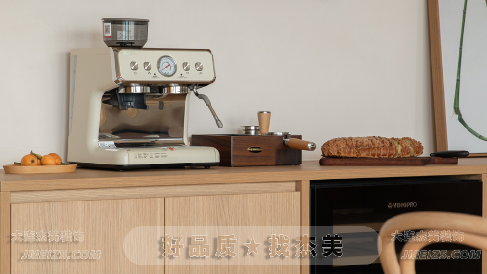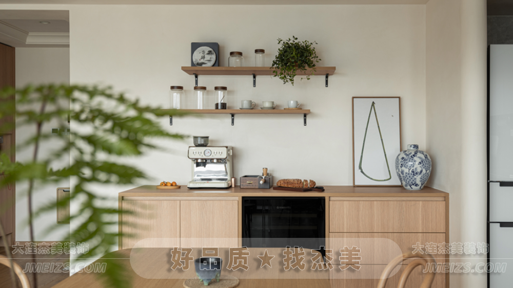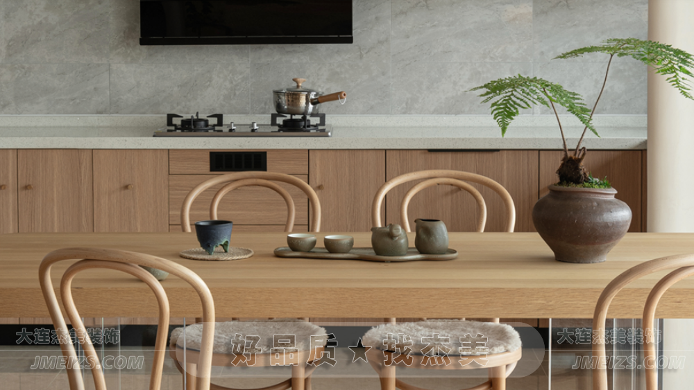 總的來說,這個餐廚空間的設計完美地融合了原木風格和現代元素。每一個細節都充分體現了杰美裝飾設計師的匠心獨運,為屋主創造了一個既實用又美觀的生活空間。