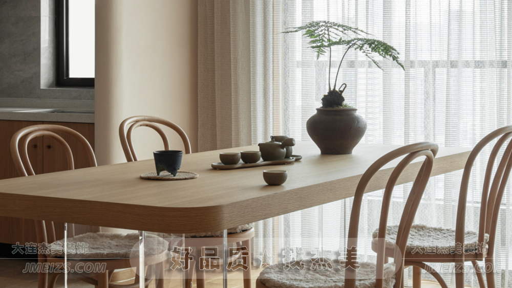 餐區的設計則更加注重細節和功能性。清新的原木餐桌和餐椅,與亞克力的支撐完美結合,為整個空間增添了一絲日式的簡約和自然。而那幾盞茶杯和綠植,則為餐區增添了一絲生活的氣息和溫馨。