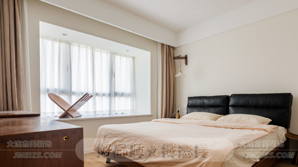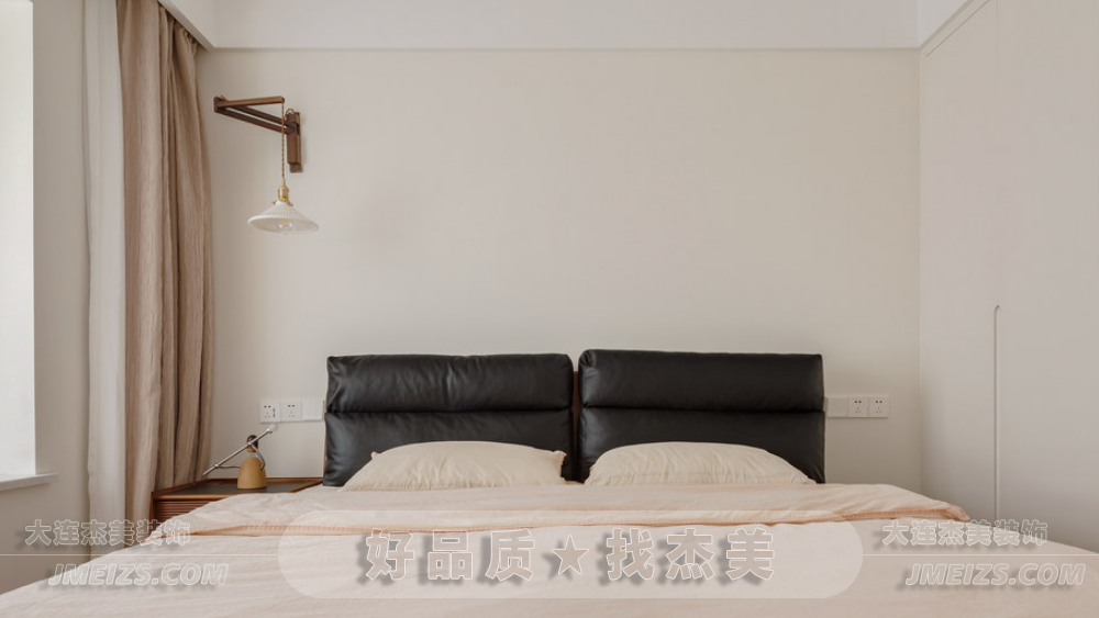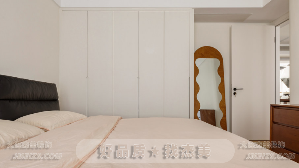 主臥的設計充分展現了原木與奶油白風格的魅力。墻面和衣柜柜體顏色統一,呈現出一種寧靜和諧的氛圍。