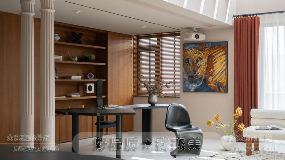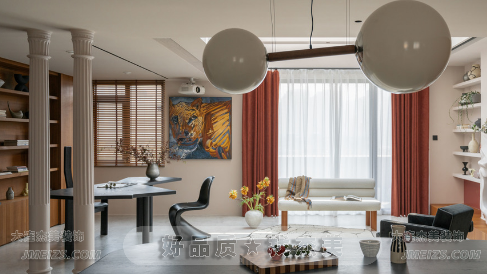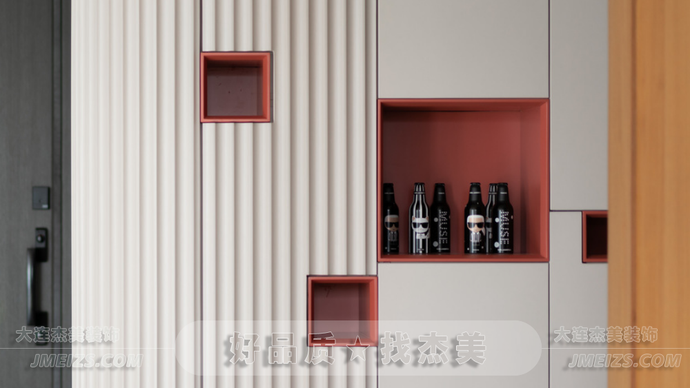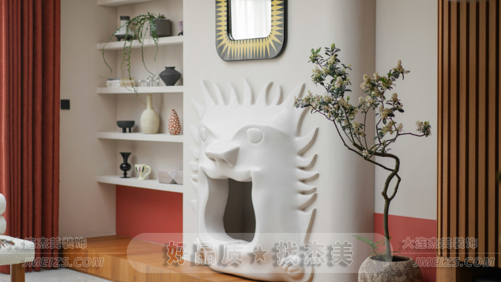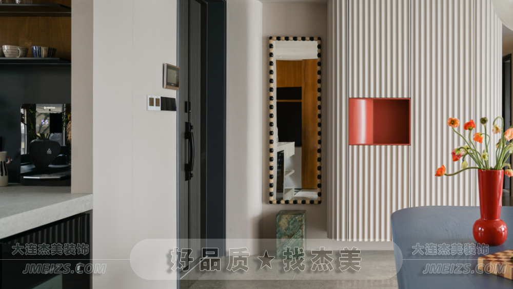 玄關設計:玄關的設計充分考慮了空間的功能性和視覺效果。正對入戶門的位置設計了兩根羅馬柱,作為裝飾隔斷,旨在規(guī)劃出玄關區(qū)域并增強進門的視野層次感。此外,玄關處還安排了換鞋凳和全身鏡,為屋主提供了方便的換鞋和整理外觀的空間。柜門上的波浪造型與羅馬柱相呼應,糖果串珠邊框的全身鏡和紅色的弧形開放格都展現了獅子座的熱情奔放和不拘一格的特點。大理石換鞋凳的設計則是對空間的一種巧妙利用,既實用又具有裝飾性。