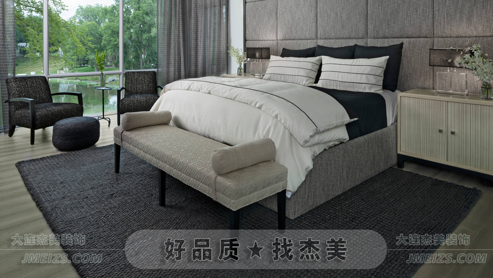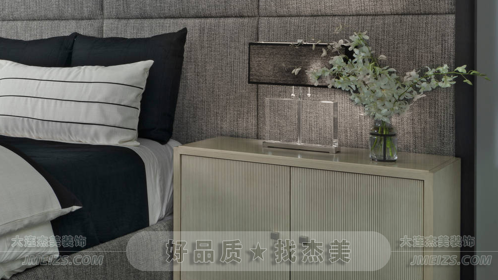 深灰色床體與白色床品色彩對比明顯,柔軟舒適的床上用品確保睡眠質量。兩側床頭柜完整布置,考慮實用性。