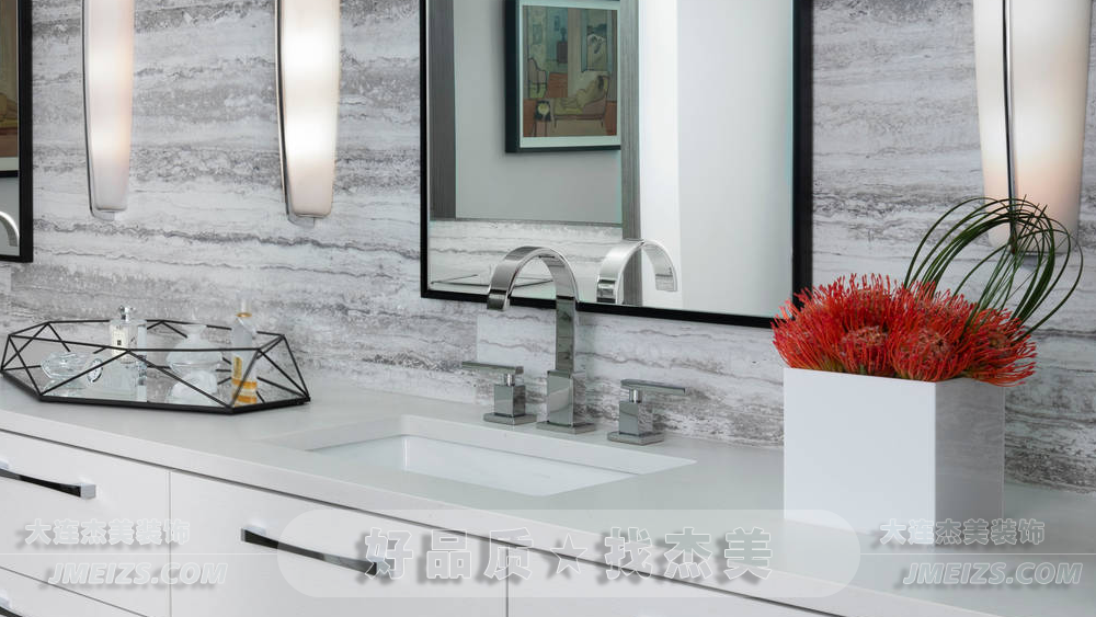 大面鏡擴大空間感,帶來明亮照明效果。金屬質感水龍頭與自然紋理灰色石材洗面盆契合簡約風格。