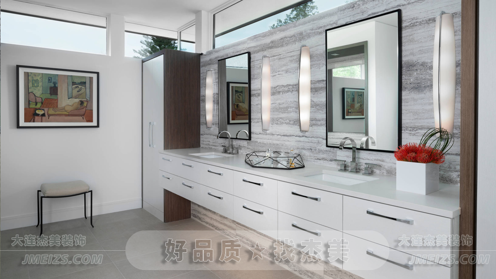 注重品質提升的極簡洗漱間設計案例。通過色彩空間處理與高品質選材應用,打造出風格簡約而高端的洗護空間。
