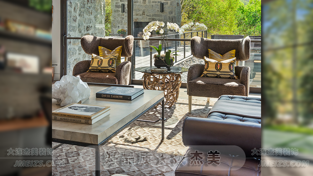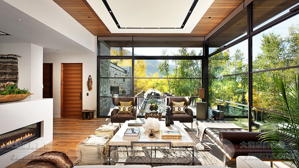 這個客廳是一個完美的結合了現代設計和大自然的空間。