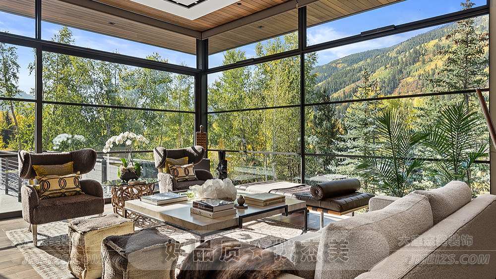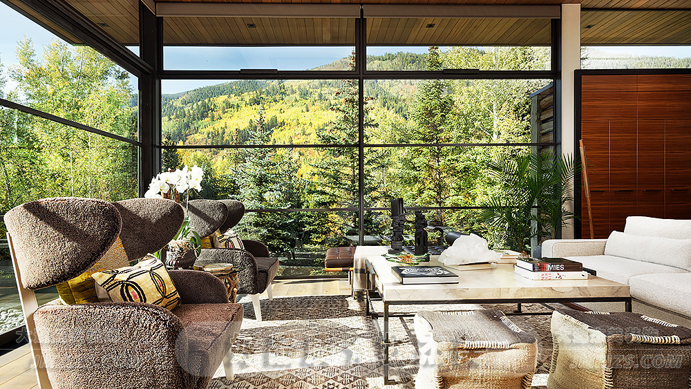 坐落在林中山上,這個客廳仿佛是大自然的一部分,與周圍的環境和諧共生。