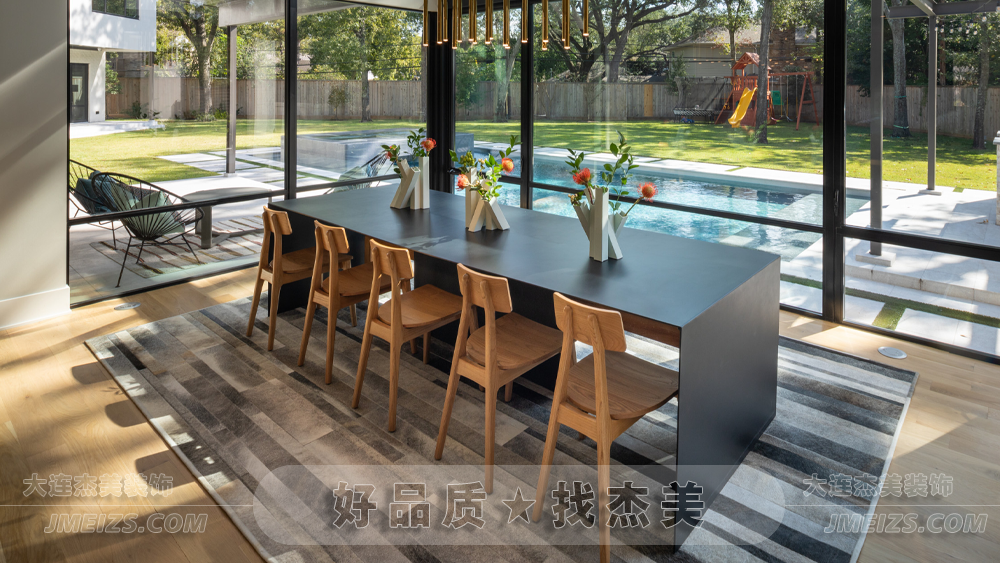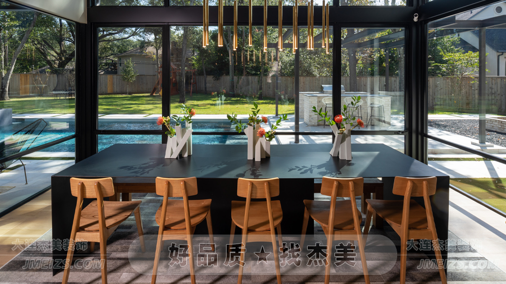 三面的落地窗,不僅為餐廳引入了充足的自然光線,還為家庭成員提供了一個開闊的視野。綠樹、陽光、藍天,每一餐都仿佛在大自然中享受,使用餐變成了一種與自然親近的體驗。
