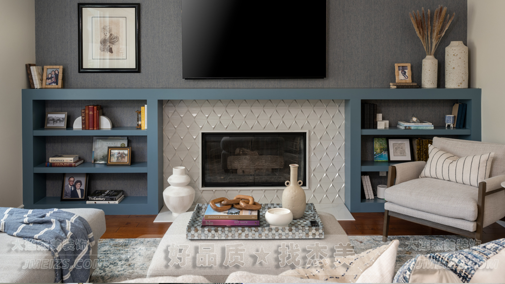 這些元素既增添了藝術感,也打破了空間的單調,為整個電視墻增添了一份生動與活潑。