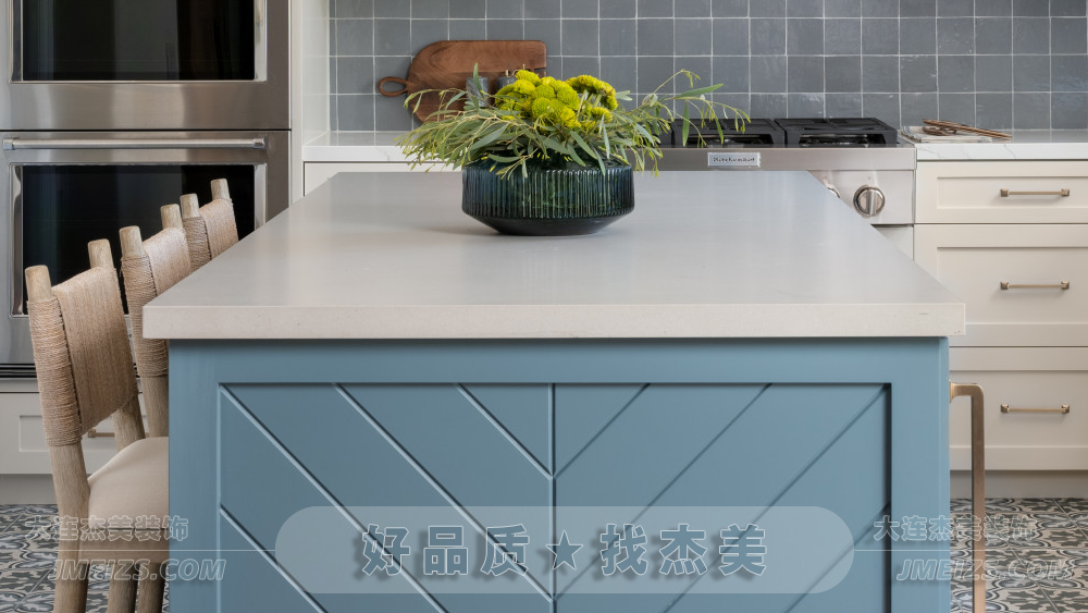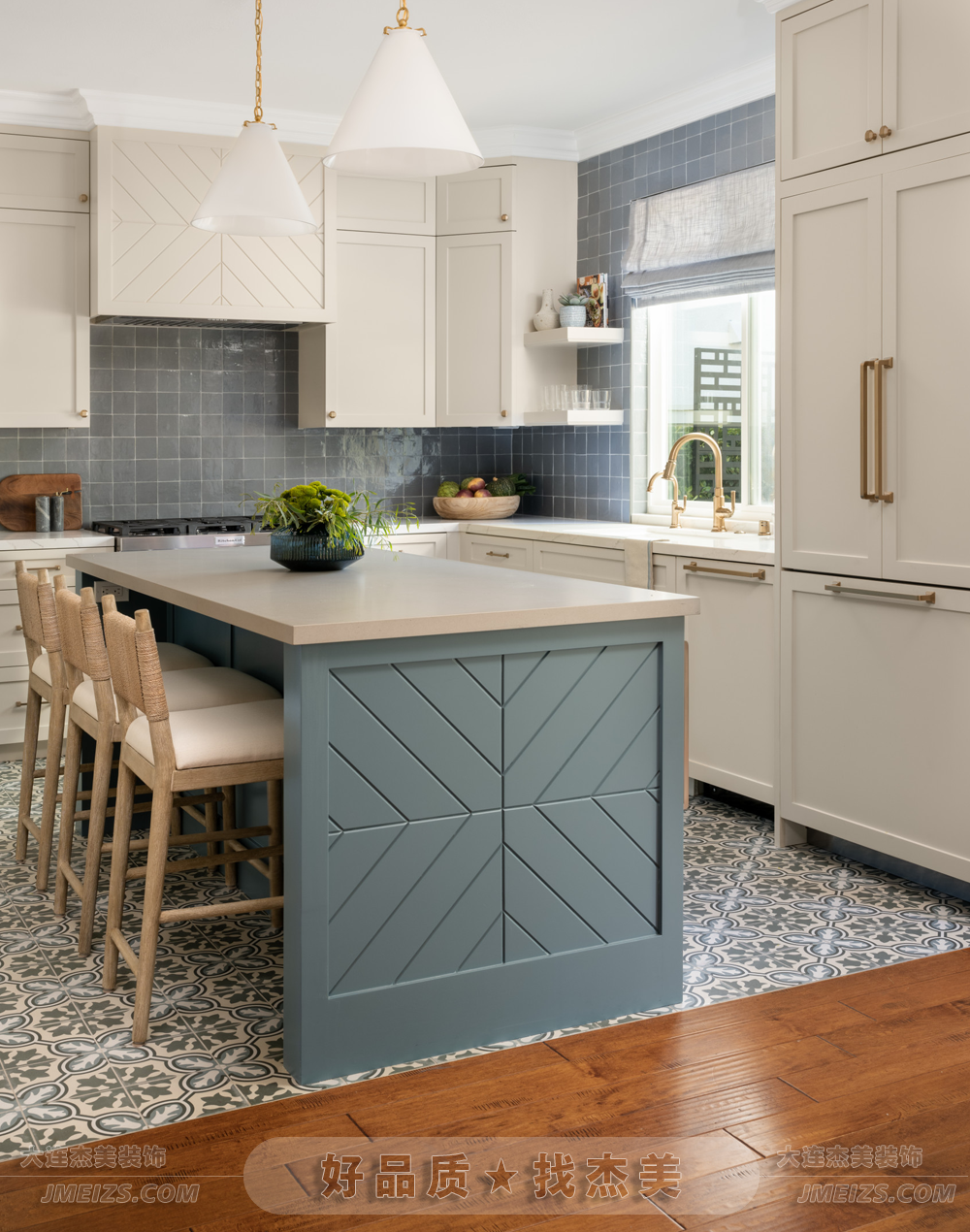 廚房中間的島臺,采用了淺藍色的柜體設計,與整體的白色形成了鮮明的對比。