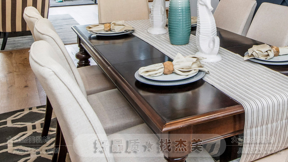 餐桌兩旁的椅子用布藝覆蓋,舒適而邀請,