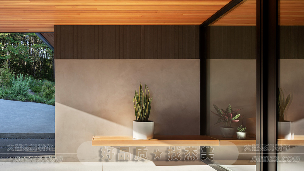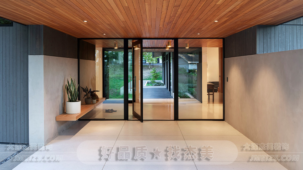 此外,門廊的設計中還巧妙地使用了懸浮木質長凳,