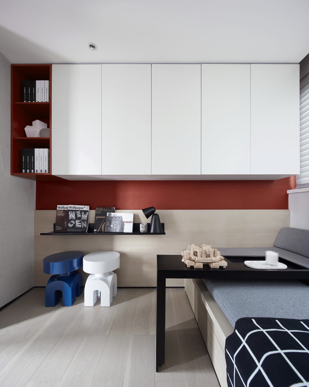 走進臥室,仿佛踏入一方寧靜素雅的天地。與外面的多彩形成鮮明對比,這里以純凈的白色為主調,營造出一種平和安寧的氛圍。紅黑底色的書柜和書桌,為這份素雅增添了一抹沉穩與個性。窗戶是臥
