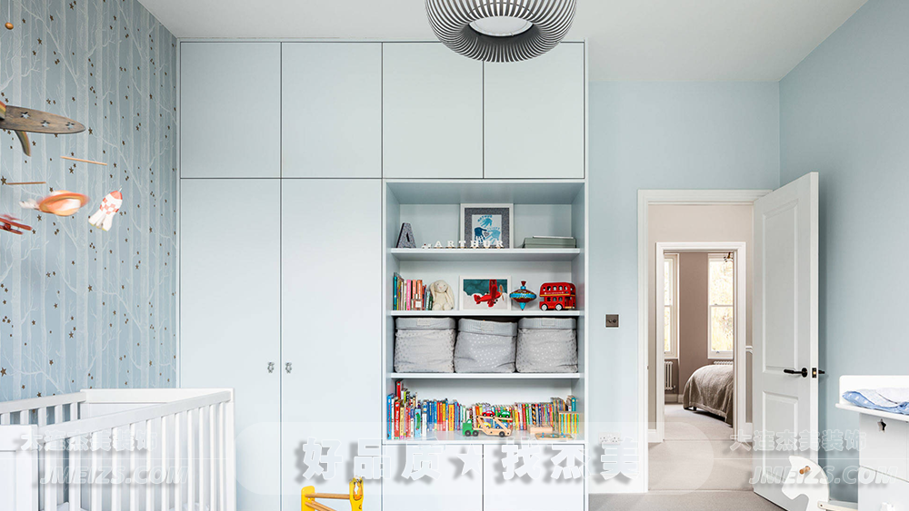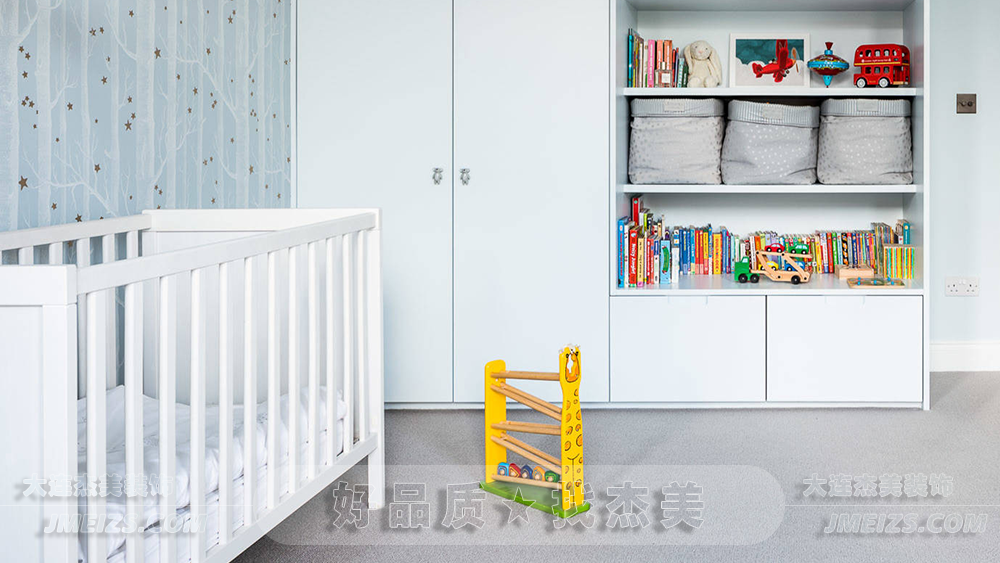 室內(nèi)的色彩以柔和的天空藍為主,給人一種如同漫步云端的輕松感。墻上淡雅的星球圖案壁紙,仿佛打開了一扇窗,引領著孩子們的想象力穿越銀河,探索星際的奧秘。這樣的設計不僅僅是視覺上的美悅,更是對孩子內(nèi)心世界的溫柔呼應。